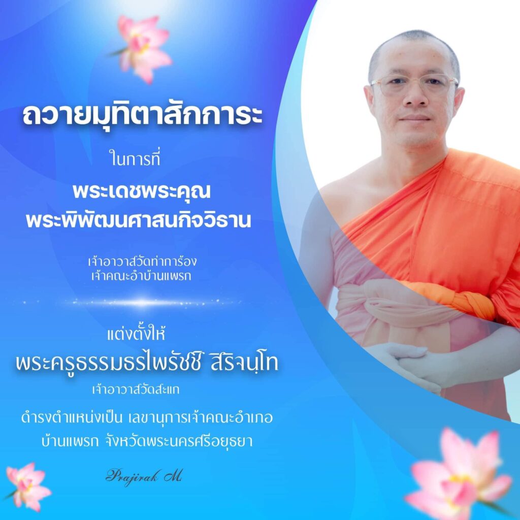 ในการที่ “พระเดชพระคุณพระพิพัฒนศาสนกิจวิธาน” เจ้าอาวาสวัดท่าการ้อง เจ้าคณะอำบ้านแพรก แต่งตั้งให้ “พระครูธรรมธรไพรัชช์ สิริจนฺโท” เจ้าอาวาสวัดสะแก ดำรงตำแหน่งเป็น เลขานุการเจ้าคณะอำเภอบ้านแพรก จังหวัดพระนครศรีอยุธยา